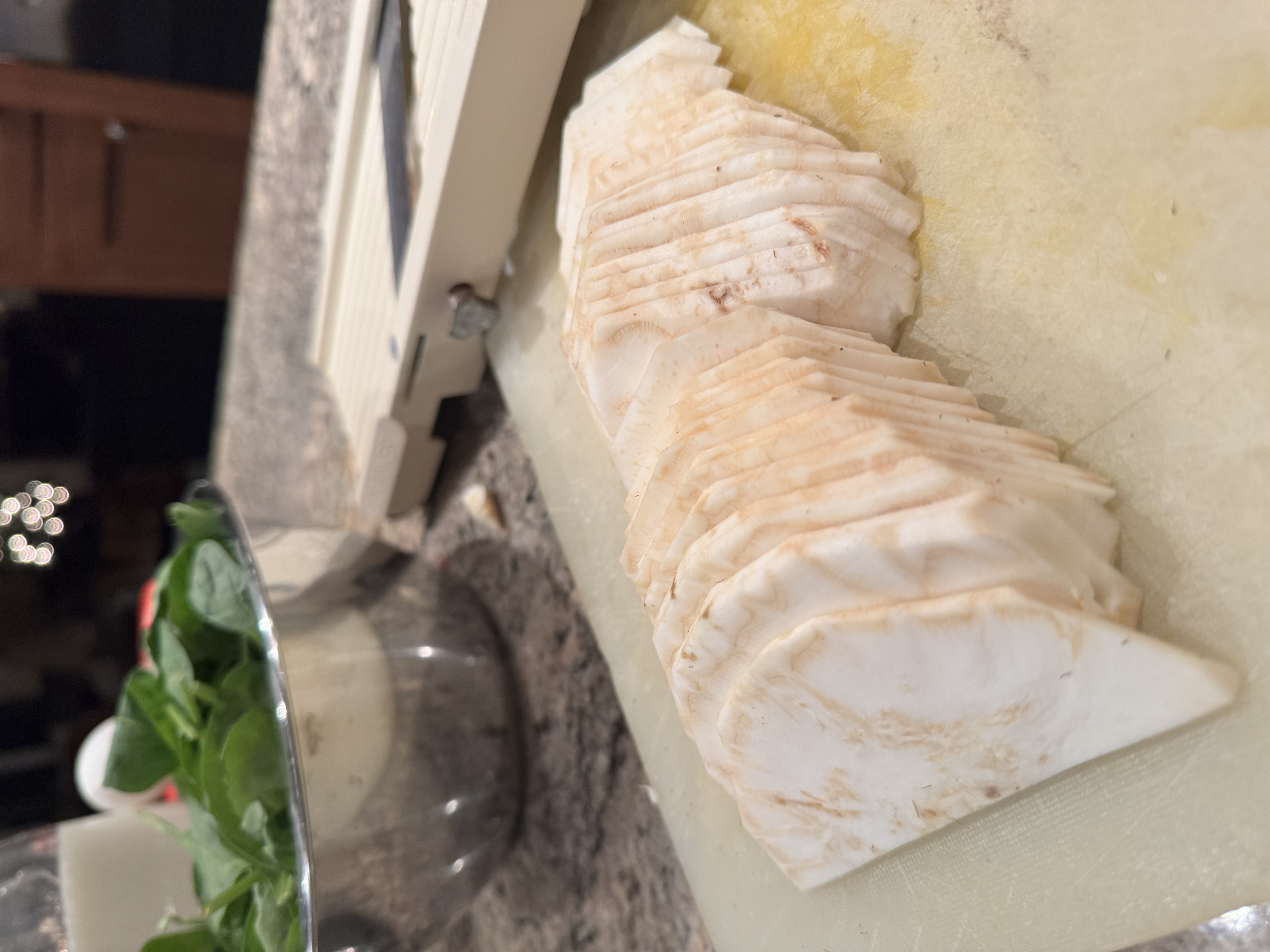 Steam celeriac; brush w/ lemon, EVOO, salt.
