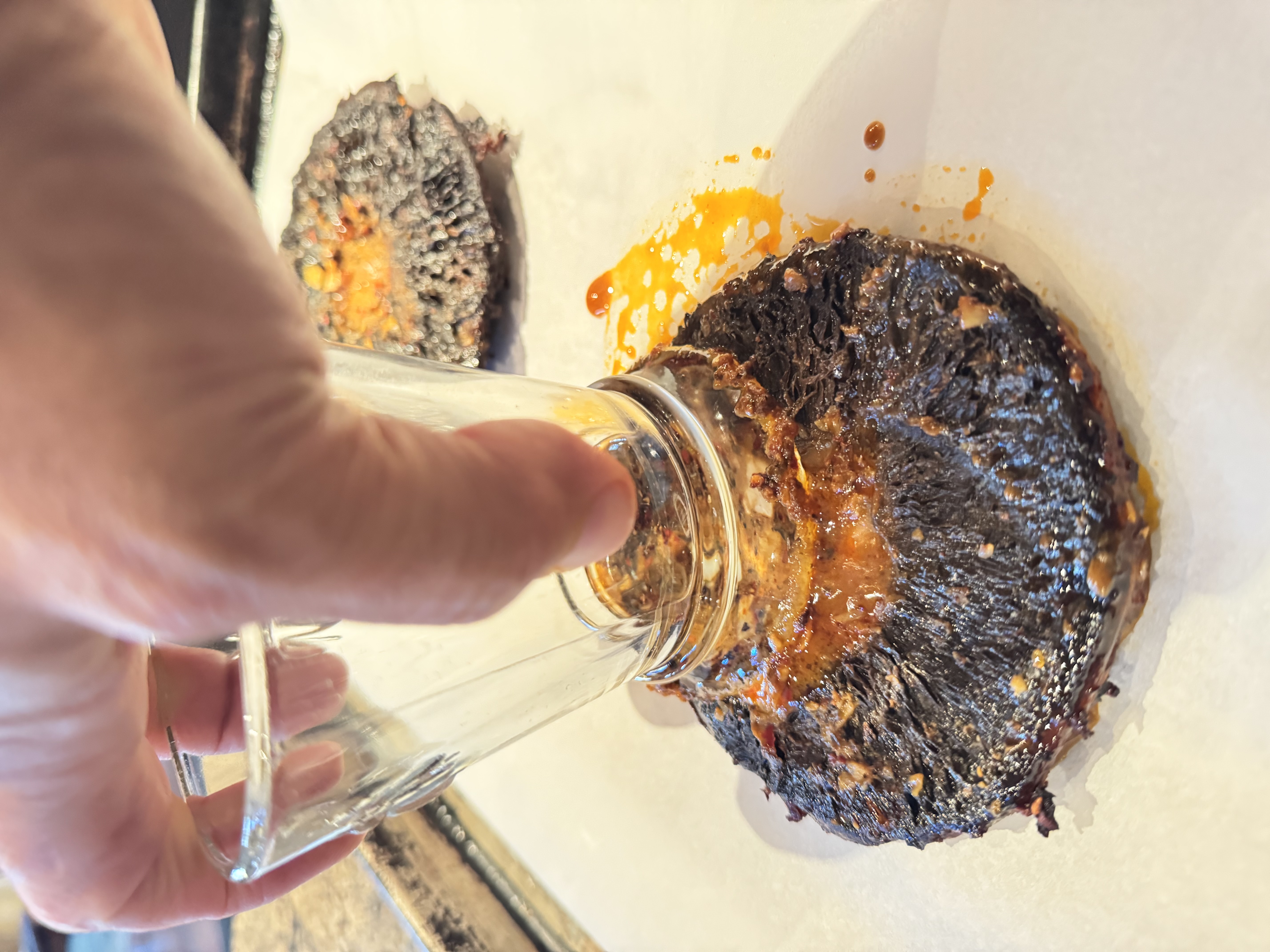 Remove from heat, flip the mushrooms, and gently smash them flat using the bottom of a clean glass, pan or rolling pin.