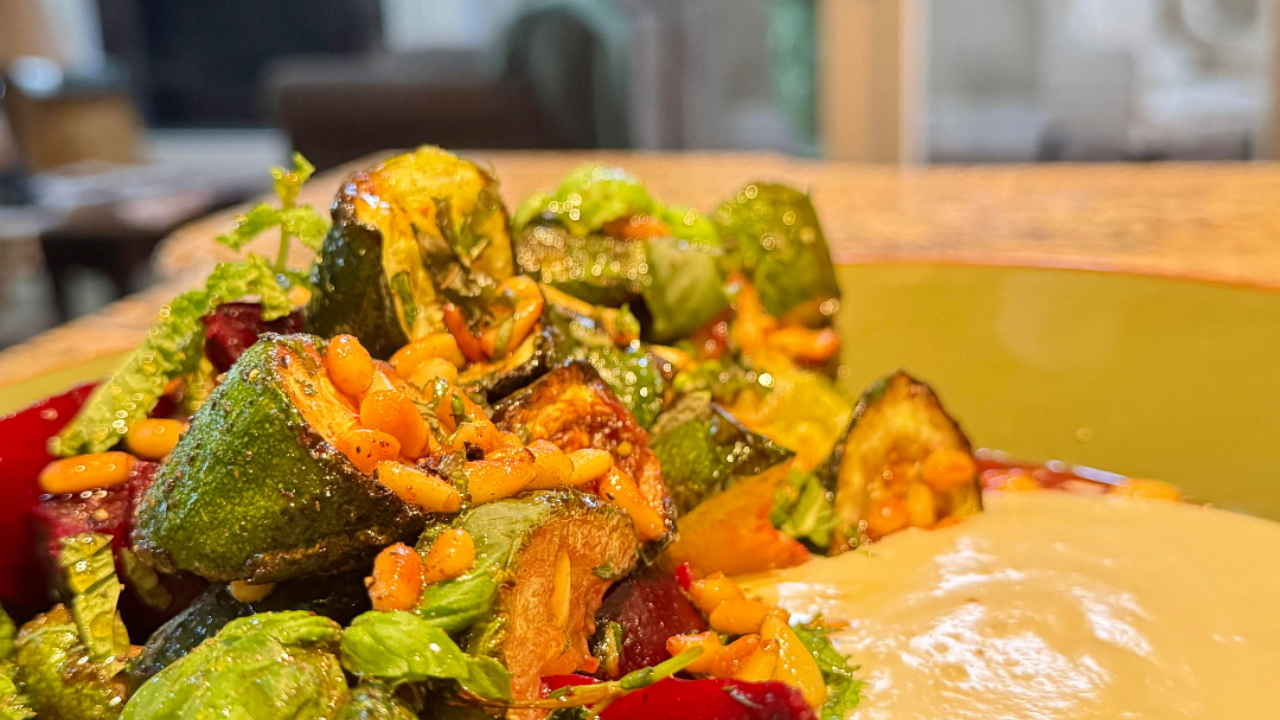 In a hot sauté pan with butter slightly toast pine nuts then add roasted zucchini and beets with salt and pepper. Plate while warm and serve on top a dollop of whipped feta with a bit extra dolloped on top. Garnish of fresh herbs of choice and a small drizzle of honey.